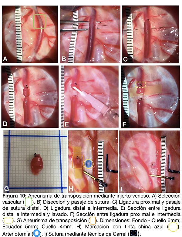Se selecciona el segmento vascular para el diseño del aneurisma (fig. 6 A-B). Se procede a la disección y sección del amnios para la preparación del aneurisma subyacente (fig. 6 C). Se debe lograr un buen plano de disección vascular para poder realizar el pasaje de un hilo de sutura (nylon 8-0) y la ligadura distal (fig. 6D-E-F).