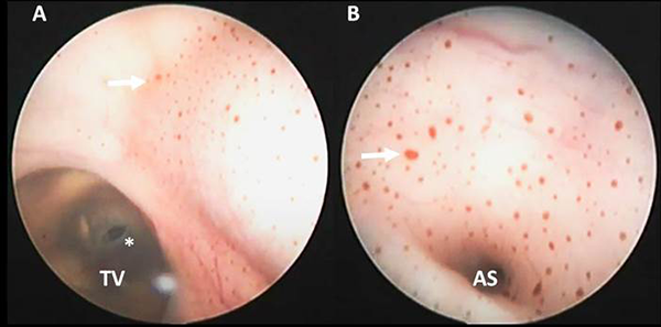 Figura 5: Visión endoscópica: Lesiones hiperpigmentadas en las paredes del epéndimo (flechas), restos de hemosiderina A) ventrículo lateral derecho se observa a través del foramen de Monro el tercer ventrículo (TV) y la fenestra realizada en el piso del mismo (*) durante la tercer ventriculostomía endoscópica, B) Porción posterior del piso del tercer ventrículo donde se observa el acueducto de Silvio (AS).