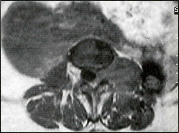 Fig. 3. IRM axial ponderarla en T1 que muestra un tejido blando hiperintenso con respecto al LCR ubicado a nivel extra e intraforaminal que invade el canal espinal.