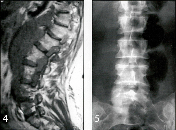Caso 2: paciente de sexo femenino y 33 años de edad, sin antecedentes significativos, consultó por dolor radicular en el territorio L5 derecho de un año de evolución. Las IRM mostraron sólo signos de degeneración artrósica discal múltiple. La radiografia simple mostró una megapófisis transversa de L5 derecha que se articulaba con el sacro (Fig. 2). Se interpretó que ésta era la causa de sus síntomas y la paciente fue llevada a cirugía para resecar la megapófisis.