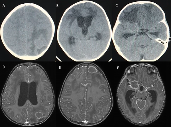 Figura 1: A, B y C: TC de ingreso. D, E y F: RMN, secuencias T1 con contraste, se observan lesiones parietal izquierda, frontal homolateral y frontobasal derecha respectivamente. Las mismas de características cortico-subcorticales de entre 11 y 20 mm de diámetro promedio, asociadas a edema vasogénico perilesional, de bordes hiperintensos en T1 con hipodensidad central e hipointensas en T2 y Flair, con realce anular y periférico tras administración de contraste. Así mismo se observó marcado realce cisternal basal tras la administración de gadolinio.