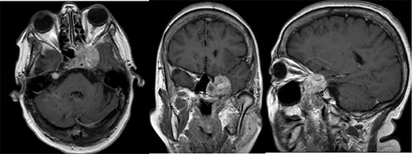 La resonancia magnética nuclear (RMN) evidenció una lesión a nivel del seno cavernoso izquierdo, la cual impresionaba proyectarse sobre el cavum, la fisura orbitaria y sector lateral izquierdo de la silla turca. Presentaba realce heterogéneo posterior a la inyección de contraste endovenoso, tenía un aspecto polilobulado y un diámetro máximo de 49x32x30 mm (CCxTxAP). (Fig 1.)