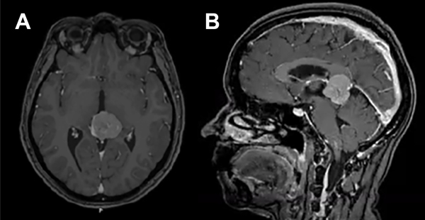 Figura 1. A. Corte axial y B. Corte sagital de resonancia magnética con Gadolíneo que toma contraste, en región pineal.