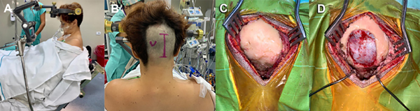 Figura 2. Abordaje suboccipital supracerebeloso infratentorial. A. Posición semisentada. B. Abordaje paramediano: marcación en piel. C. Exposición craneal. D. Craneotomía.