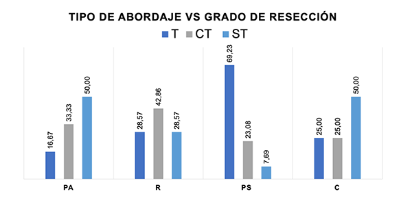 Figura 1. Tipos de abordajes vs grado de resección. Se muestra en el grafico el porcentaje de pacientes que en cada tipo de abordaje se les realizo una resección total (T), casi total (CT) o subtotal (ST).