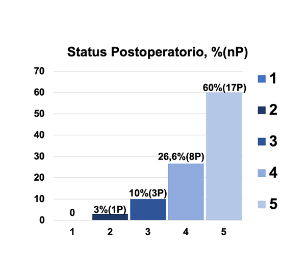 Figura 2. Status Postoperatorio. Se clasificaron los pacientes en cinco grupos distintos en el postoperatorio: (1) - Muerto por otra causa (2) - Clínicamente peor (3) - Clínicamente sin cambios (4) - Clínicamente con mejoría (5). Se presenta el porcentaje de pacientes y número de pacientes por grupos.