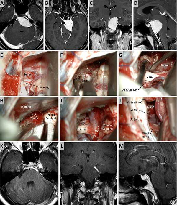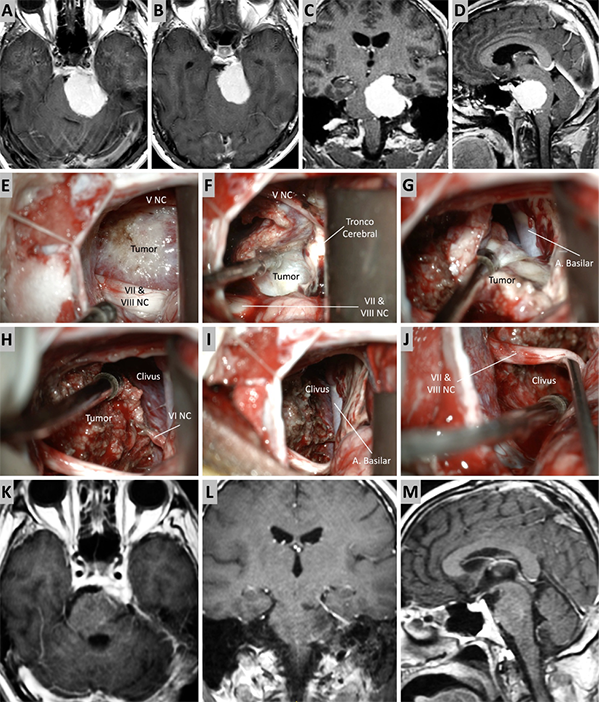 Figura 5. Caso ilustrativo #3. A-D. Resonancia que muestra MRPC con implantación clival. E-J. Se realiza un abordaje retrosigmoideo, consiguiendo la liberación del complejo VII-VIII del tumor y su resección completa. K-M. Resultado imagenológico postquirúrgico.
