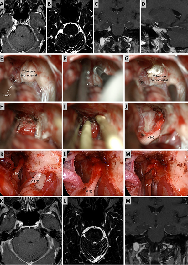 Figura 6. Caso ilustrativo #4. Meningioma de la MRPC con implantación petrosa anterior. El paciente presentaba neuralgia del trigémino atípica derecha. A-D. Imágenes por RMN pre operatorias. E-J. Se realiza un abordaje retrosigmoideo consiguiendo la resección total del tumor. K-M. Con ayuda de endoscopio y lente con angulación de 30º se inspecciona el área sin encontrar remanente tumoral. Se observa liberación del nervio trigémino. K-M. RMN postoperatoria que muestra resección total.