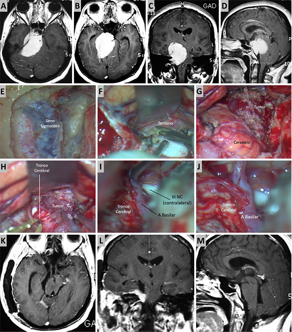 Figura 8. Caso ilustrativo #6. Resonancia que muestra MRPC con implantación petroclival y extensión a la fosa media. A-D. Se presentan las imágenes prequirúrgicas, corte axial, coronal y sagital. E-J. Se realizo un abordaje presigmoideo combinado con un abordaje subtemporal, logrando una exposición del seno sigmoideo y una visión directa del tumor consiguiendo una resección total. K-M. RMN posquirúrgica donde se observa una resección quirúrgica total.