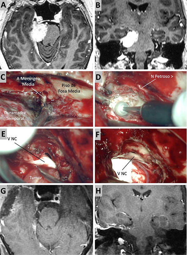 Figura 9. Caso ilustrativo #7. A-B. Meningioma de la MRPC con implantación petrosa anterior. C-F. Se realiza un abordaje subtemporal y petrosectomia anterior. G-H. Imagen por RMN. Resección completa.