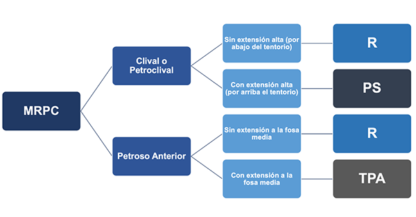 Figura 13. Algoritmo de elección de una ruta de abordaje quirúrgica en MRPC. Para la elección de un abordaje quirúrgico los MRPC pueden agruparse en petrosos anterior o clivales y petroclivales por su cercanía anatomíca. En el caso de los meningiomas petrosos anterior se debe evaluar si tienen o no extensión a la fosa media para decidir entre un abordaje retrosigmoideo (R) o un abordaje transpetroso anterior (TPA). Para los meningiomas clivales y petroclivales se debe tener en cuenta su relación con el tentorio, en caso de sobrepasarlo un abordaje presigmoideo (PS) sería la elección.