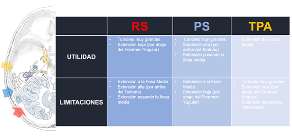 Resulta importante la zona donde se implanta el tumor, lo que es bien aclarado por los autores; ya que muchos tumores que se asumen como petroclivales en la literatura, son en realidad meningiomas petrosos anteriores o inclusive petrosos posteriores y esto cambia radicalmente la complejidad y la morbimortalidad del tratamiento quirúrgico.