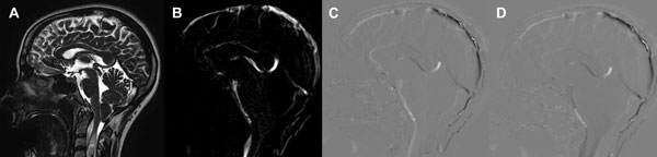 Figura 1: Evaluación cualitativa en RM con técnica de contraste de fase. A: Imagen ponderada en T2 de alta resolución de cortes finos (3mm) que muestra el descenso amigdalino a través del foramen magno, el compromiso de las cisternas peritroncales y una siringomielia con imagen de turbulencia de flujo en su interior. B: Imagen en secuencia de fase que utiliza el contraste entre negro y blanco mostrando con señal hiperintensa el flujo de LCR cisternal C: Imagen de magnitud en fase anterógrada que muestra con señal hiperintensa el flujo en sístole. D: Imagen de magnitud en fase retrógrada que muestra con señal hipointensa el flujo en diástole. Con la valoración de estas secuencias en su totalidad y en reproducción en cine de las imágenes estáticas se logra la evaluación del pasaje de LCR a través de las cisternas peritroncales y los forámenes del cuarto ventrículo.