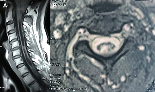 Figura 5: Caso 3. A: RM de columna cervical en plano sagital ponderada en T1, postoperatoria que muestra una siringomielia con ocupación parcial del canal. B: RM de columna cervical en plano axial ponderada en T2 postoperatoria que sugiere una comunicación entre la cavidad siringomiélica y el espacio subaracnoideo.