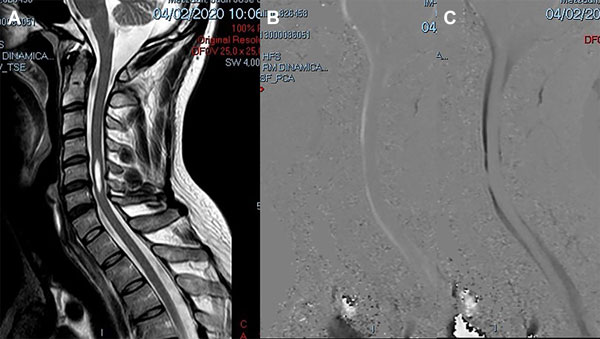 Un varón de 38 años de edad consultó por haber padecido una cérvico braquialgia derecha 30 días antes. En el momento de la consulta sus síntomas habían desaparecido y el examen neurológico fue normal. La RM mostró discopatías cervicales múltiples con una dilatación quística en la médula cervical a nivel C5-C6 que no tomaba el contraste con gadolinio (Figura 6A). Para profundizar el diagnóstico diferencial se realizó una RM en contraste de fase para medir la velocidad del LCR a nivel del canal cervical. La velocidad medida fue de 11 cm/seg (Figura 6B-C). Se hizo el diagnóstico de SM espinal primaria causada por una discopatía cervical a nivel C5-C6. Como el paciente estaba asintomático sólo se indicó control periódico. En su última evaluación, 2 años después, la situación clínica e imagenológica no había cambiado por lo que se mantuvo la misma conducta.