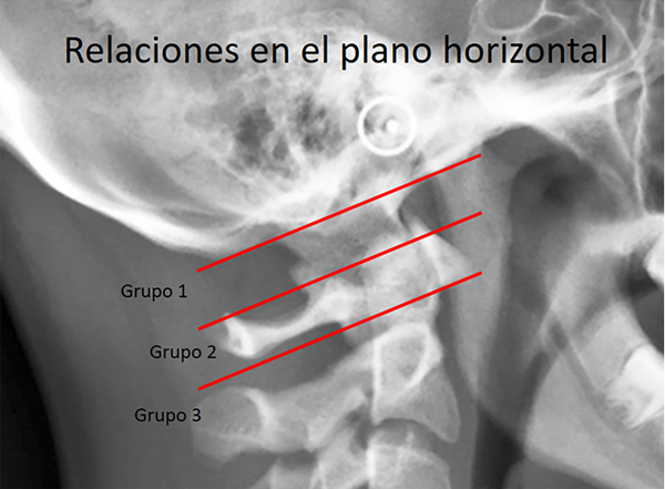 En el plano horizontal se dividieron los bucles en tres grupos en base a su relación con las estructuras de la unión craneocervical. El grupo 1 está delimitado entre el foramen magno y el borde superior de la lámina de C1. El grupo 2 abarca el ancho de la lámina de C1, y el grupo 3 incluye los bucles que sobrepasan el límite inferior de la lámina de C1 (figura 1).
