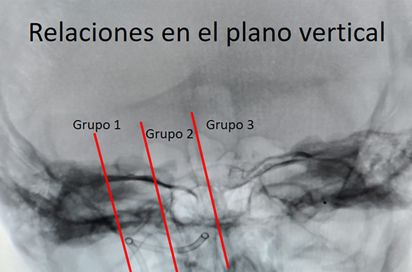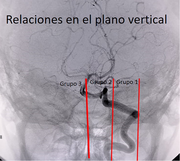 En el plano vertical se dividieron los bucles en 3 grupos en relación a dos líneas: una que une las estructuras de línea media (apófisis espinosas) y otra por la cara externa de la arteria vertebral. El grupo 1 o externo se limita entre el borde externo de la arteria vertebral y el punto medio entre esta y la apófisis espinosa. El grupo 2 esta determinado por el límite interno del grupo 1 y la línea media y en el grupo 3 se encuentran aquellos “loops” que pasan la línea media.