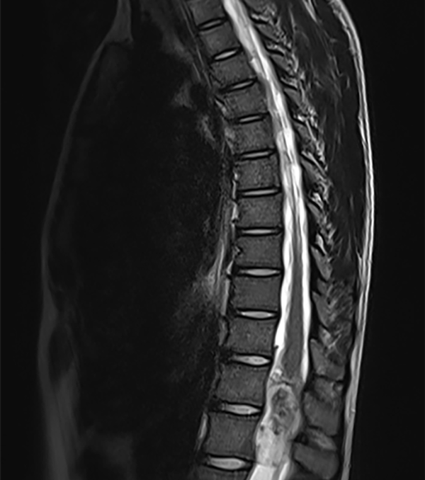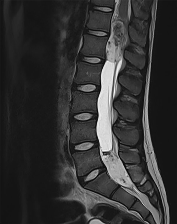 Figura 1. RM secuencia T2: Tumor intradural intramedular en cono medular T12–L1