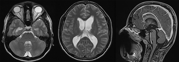 Figura 3. RM de encéfalo, secuencia T2 y con contraste (izquierda a derecha): diámetro de la vaina del nervio óptico mayor a 5 mm, edema transependimario e hidrocefalia.