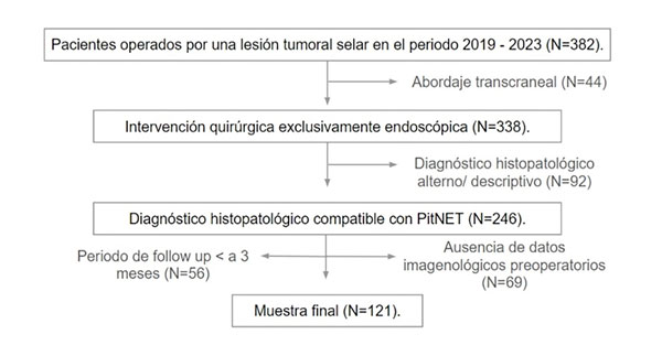 Se realizó un estudio observacional retrospectivo analítico de una cohorte inicial de 382 pacientes con diagnóstico de tumor selar operados por un mismo neurocirujano en un centro de tercer nivel de la Ciudad Autónoma de Buenos Aires, durante el período comprendido entre 2019 a 2023. De esta muestra inicial, se excluyeron 44 pacientes por haber sido intervenidos mediante un abordaje transcraneal, 92 pacientes con diagnóstico histopatológico no compatible con PitNET, 69 casos con ausencia de imágenes preoperatorias en la base de datos de nuestro centro, y 56 pacientes por no contar con un seguimiento dentro de la institución mayor a 3 meses. El total de pacientes excluidos fue de 261, obteniendo así el número final de la muestra de 121 pacientes (Figura 1). Se analizaron características demográficas, clínicas, imagenológicas, quirúrgicas e histopatológicas, y las influencias de estas en el riesgo de fístula intraoperatoria y postoperatoria. Las Tablas 1 y 2 resumen las variables incluidas. Se revisó la literatura sobre esta complicación a fin de comparar otras series y resultados. La obtención y el análisis de datos se concretó de manera anónima, y en simultáneo a la evolución de cada paciente (previamente a la realización de la intervención, en el acto intraoperatorio y en el postoperatorio). No se involucró ningún tipo de información personal relacionada con los pacientes. El estudio fue aprobado por el Comité de Ética de nuestra institución.