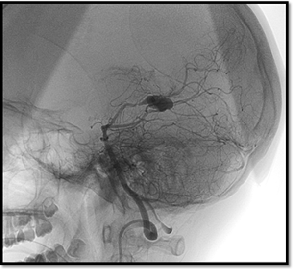 Figura 1. Angiografía digital diagnóstica de vasos intracraneales. Se evidencia dilatación aneurismática del segmento P3 de arteria cerebral posterior derecha.