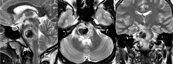 Figura 3. RM preoperatoria de encéfalo. Se evidencia una lesión única intraaxial centrada en puente y pedúnculo cerebeloso derecho, sugerente de un cavernoma roto. A, B y C) Imágenes ponderadas en T2 en cortes sagital, axial y coronal, respectivamente, donde se observa un importante hiperintensidad perilesional, sugerente de edema.