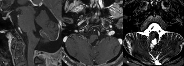 Figura 9. RM preoperatoria de encéfalo. Se evidencia una lesión única intraaxial bulbotrigonal izquierda, que contacta la mitad inferior del piso del cuarto ventrículo, hiperintensa en T1 y T2, con vacíos de flujo que impresionan provenir de una malformación del desarrollo venoso, lo que sugiere una malformación cavernomatosa. A) Imagen en corte sagital ponderada en T1 posterior a la administración de gadolinio. B y C) Imágenes en corte axial ponderadas en T1 y T2, respectivamente.