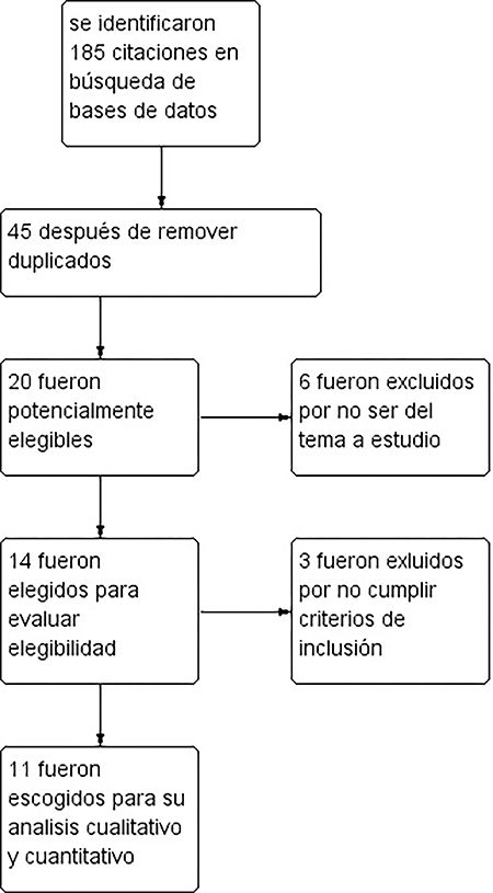 Tras realizar la búsqueda sistemática de la información siguiendo nuestra estrategia se identificaron 185 citas bibliográficas, de las cuales 20 se consideraron potencialmente elegibles sobre la base de título o el resumen, o ambos, y se obtuvieron los textos completos. Después de una revisión del texto completo, 14 ensayos se consideraron elegibles, 3 fueron descartados por no cumplir criterios de inclusión11,13,26 y 11 reunieron los criterios de inclusión para la revisión (graf. 1; anexo A y B).1,3-5,8,15,18,19,21,24,27