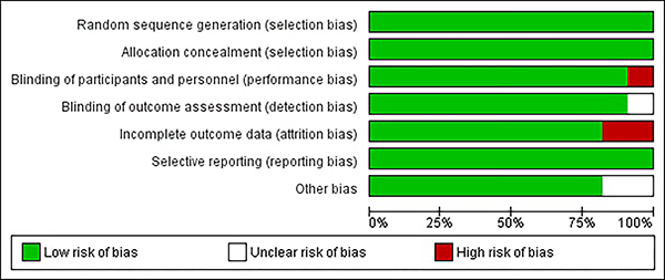Se evaluó el riesgo de sesgo para los distintos estudios escogidos mediante la metodología descrita y se encontró que el 20% de los estudios presentaron riesgo no claro de cegamiento de los resultados, 15% de alto riesgo de sesgo en el cegamiento del personal y de los participantes, y 25% de sesgo de datos incompletos, 8 estudios estuvieron libre de sesgo (graf. 2 y 3).