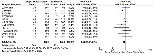 Se escogieron 11 estudios para el análisis final, que involucran 3247 pacientes. En todos los estudios se evaluaron los desenlaces a 6 meses mediante la escala de Rankin modificada. Se evidenció una reducción de la mortalidad en pacientes que se trataron con terapia endovascular comparada con el manejo médico (OR 0,78, IC del 95%: 0,63-0,95 p= 0,01), con baja heterogeneidad entre los estudios (X2 = 10,8 df = 10 I2= 7% p= 0,37) (tabla 1 y graf. 4).