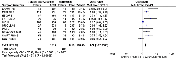 Este estudio reporta los análisis detallados de 11 Ensayos clínicos aleatorios que compararon la terapia endovascular (trombectomía con o sin colocación de stent, con o sin aplicación de fibrinolítico a través de esta terapia) con el manejo médico actual (terapia fibrinolítica endovenosa) para pacientes con accidente cerebrovascular isquémico. La trombectomía se asoció con disminución de la mortalidad, aumento de la tasa de revascularización, mejoría del desenlace funcional (independencia funcional evaluada con mRs a 90 días). No hubo diferencia en cuanto a la recurrencia de isquemia cerebral ni de la aparición de hemorragia intracerebral. En el análisis de sensibilidad evidenciamos que el uso de tPA y el uso de stent asociados a la trombectomía mecánica son factores importantes que se asocian en los resultados de los desenlaces favorables.