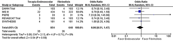 El manejo con terapia endovascular presenta un aumento de la tasa de revascularización del vaso ocluido en comparación a control (OR 6,16, IC del 95%: 4,39-8,64 p= <0,0001) (X2 = 3,47 df = 3 I2= 14% p= 0,32) (graf. 5).