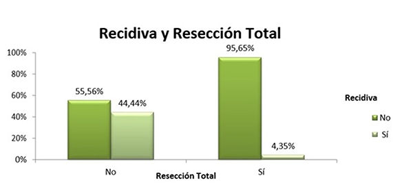 En cuanto al análisis de las variables resección y recidiva, se observó que la resección fue total en 23 pacientes (71,88%).