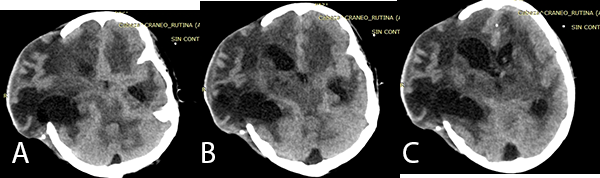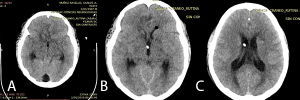 Imagen 2: (A), (B) y (C) TEM cerebral sin contraste en corte axial muestra leve dilatación ventricular con catéter de DVE, además de ligera asimetría entre hemisferios cerebrales.