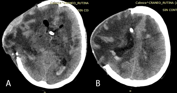 Imagen 5: (A) y (B) TEM cerebral sin contraste en cortes axiales post fenestración y colocación de nuevo DVE: se evidencia disminución de la asimetría ventricular y disminución de protrusión por defecto óseo craneal.