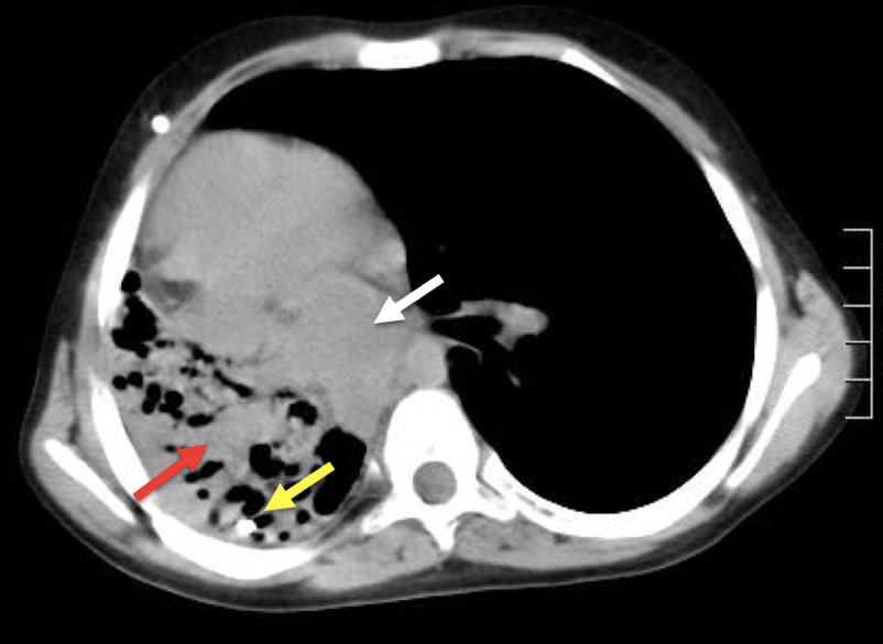 Figura 2: Tomografía computarizada del tórax del Caso 1, que muestra el catéter distal migrado dentro del parénquima pulmonar derecho. Nótese la hiperdensidad patológica del tejido pulmonar (flecha roja) con el catéter distal migrado (flecha amarilla) y la retracción y desplazamiento del mediastino (flecha blanca).