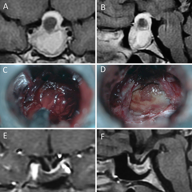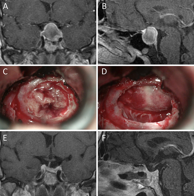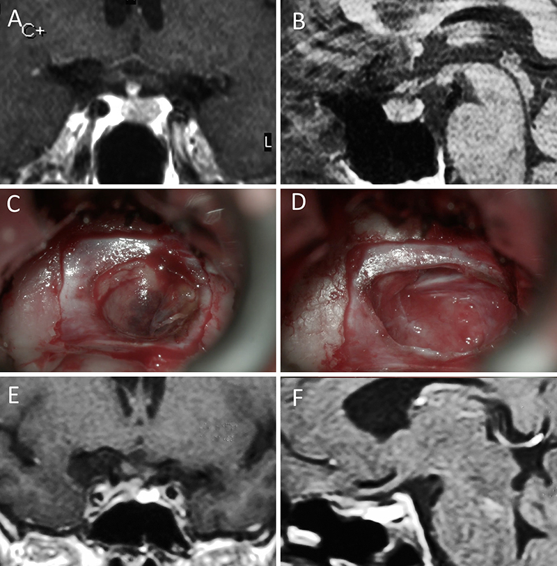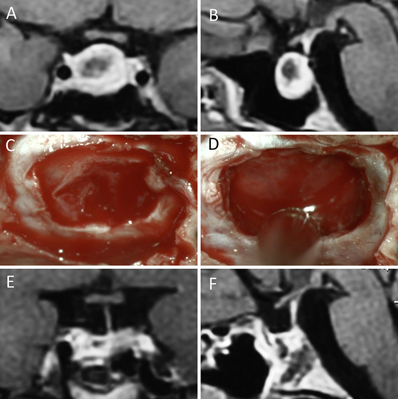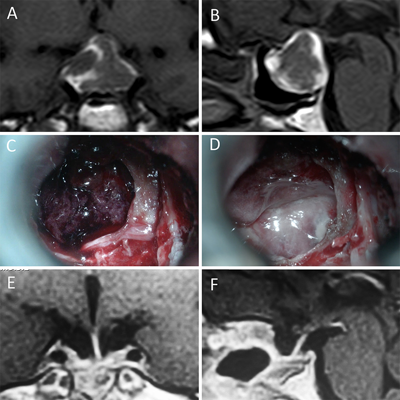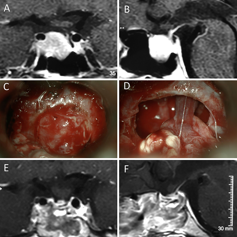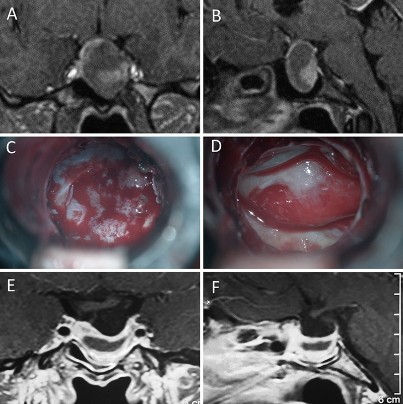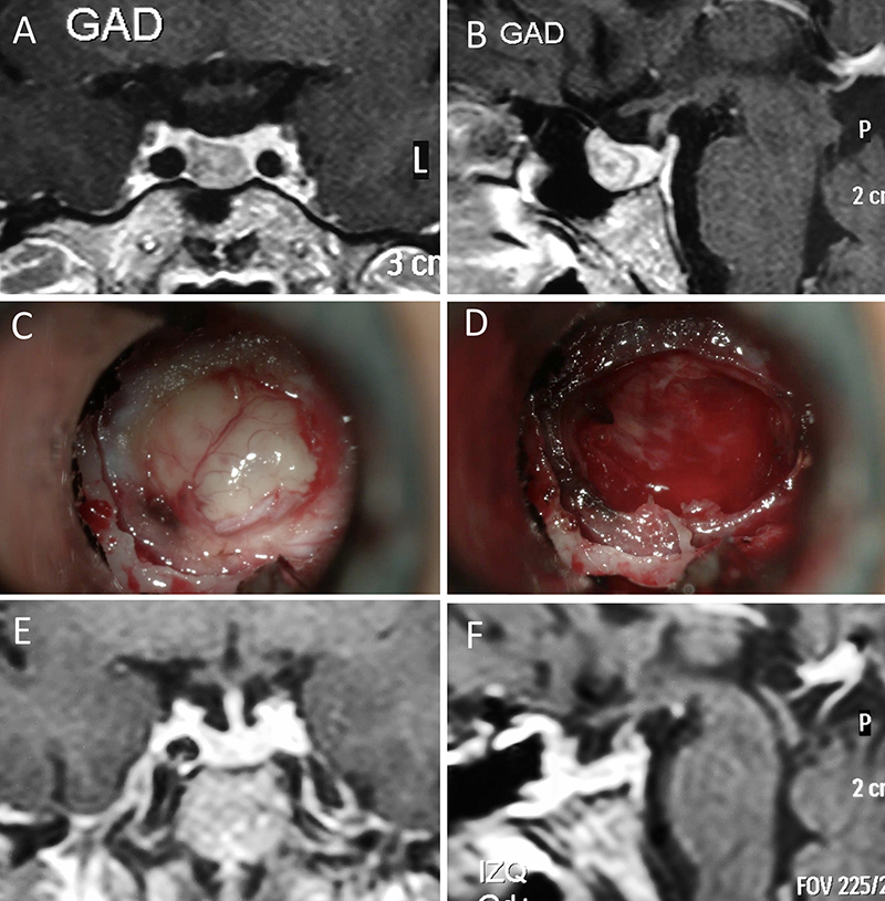 Figura 3: Macroadenoma no funcionante en un hombre de 64 años. El paciente presentó en el preoperatorio déficit visual que mejoró tras la cirugía. A-B: RM preoperatoria; C-D: intraoperatorio; E-F: RM postoperatoria.