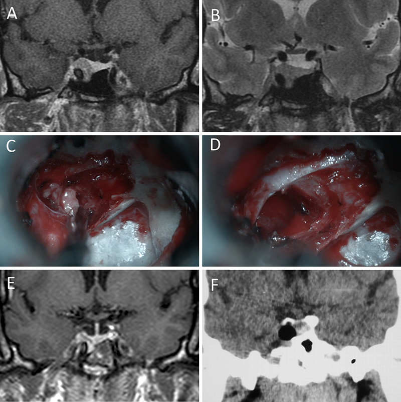 s. Se decidió la cirugía tras evidenciarse crecimiento en los controles. Evolucionó favorablemente desde el punto de vista clínico-radiológico. A-B: RM preoperatoria; C-D: intraoperatorio; E-F: RM postoperatoria.