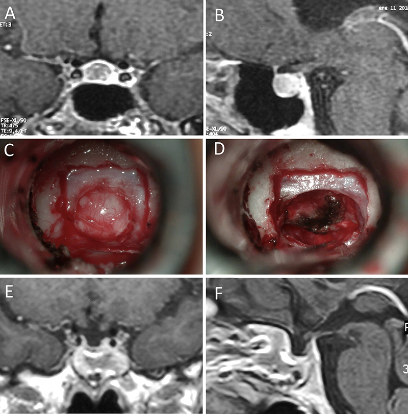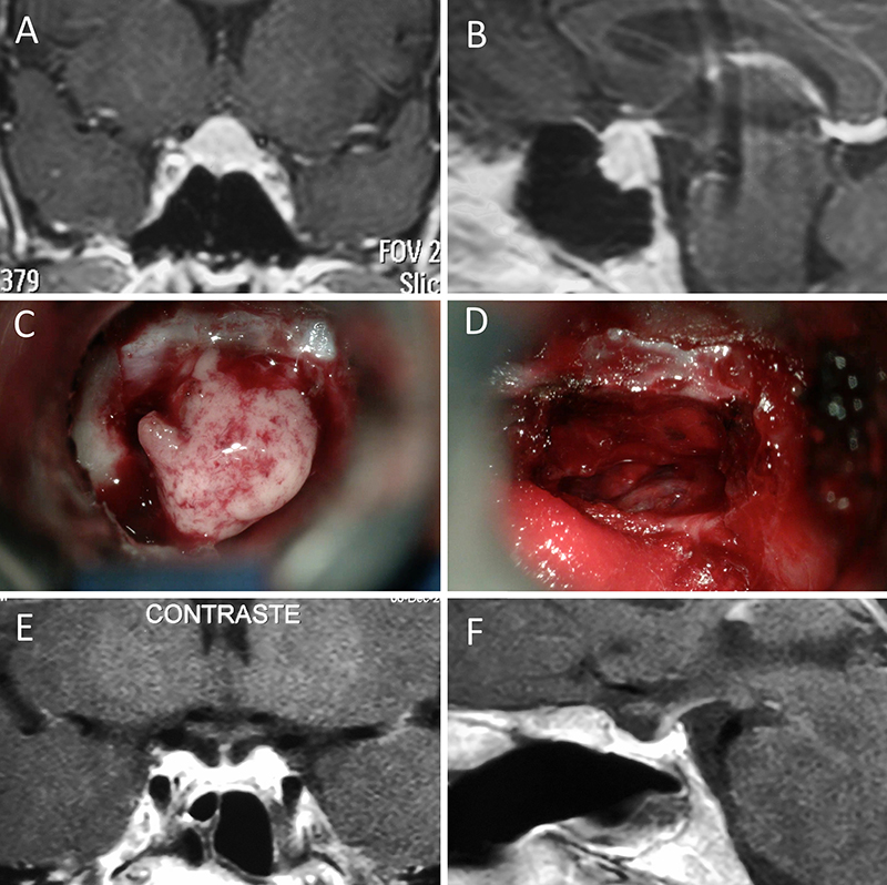 Figura 4: Macroadenoma no funcionante en mujer de 32 años. La paciente presentó en el preoperatorio déficit visual que mejoró tras la cirugía. A-B: RM preoperatoria; C-D: intraoperatorio; E-F: RM postoperatoria.