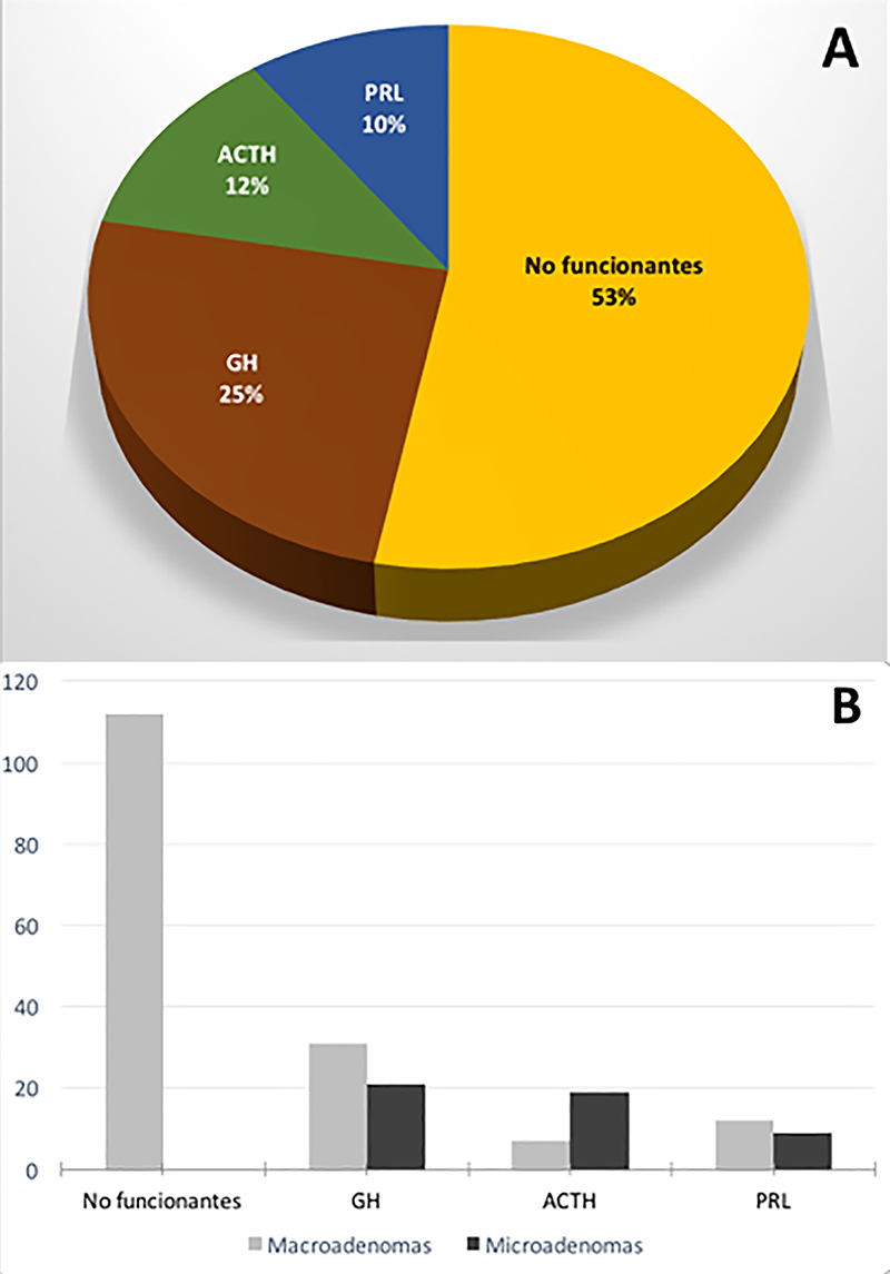 Según el tipo de presentación clínica y de laboratorio endocrinológico, se dividió a los pacientes en no funcionantes o funcionantes (acromegálicos, con enfermedad de Cushing o bien pacientes con prolactinomas). En el caso de los prolactinomas, la decisión de cirugía fue tomada por falta de eficacia del tratamiento médico, intolerancia a la medicación por parte del paciente o cuadro de apoplejía durante el tratamiento con cabergolina.