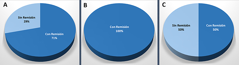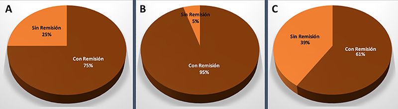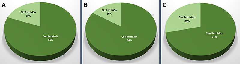 Gráfico 4: Resultados en pacientes con Enfermedad de Cushing. A: Remisión bioquímica global. B: Remisión bioquímica en el caso de los microadenomas. C: Remisión bioquímica para los macroadenomas.