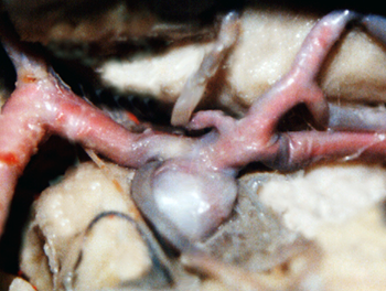 Figura 1: Hallazgo de disección que muestra un aneurisma silviano. Si bien esto muestra que no todos los aneurismas sangran, si el mismo hubiera sido hallado en vida de la persona, debería haber sido tratado.