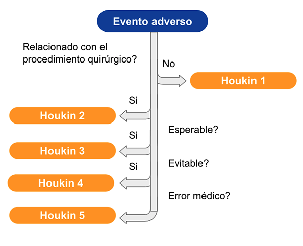 Se consideró Houkin tipo 2, ya que el evento adverso estuvo relacionado con el procedimiento quirúrgico pero no era ni esperable ni evitable.