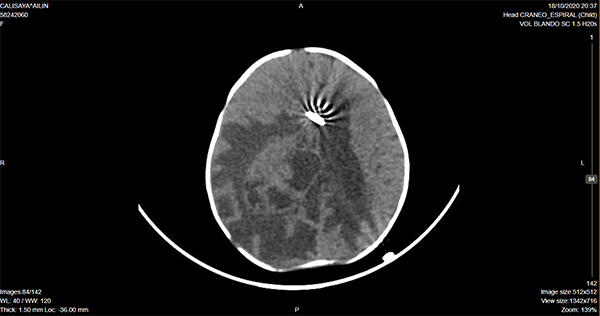Paciente de 4 meses de vida, fue llevada a la guardia por vómitos intermitentes, posteriormente agregó sensorio alternante, tendencia al sueño. Al examen físico se evidenció perímetro cefálico aumentado, fontanela llena, estrabismo convergente ojo izquierdo intermitente y retraso de adquisición de pautas madurativas: no sigue objetos y sin sostén cefálico. Se realizaron múltiples punciones transfontanelares en otra institución y se derivó a nuestro centro. Ingresó en la madrugada y se realizó cirugía de colocación de drenaje ventricular al exterior. Posteriormente a las 12 hs presentó descompensación, con deterioro del sensorio. En imagen control por tomografía se evidenció ventrículo ipsilateral a lesión colapsado y herniación subfalcial, por lo que se realizó cirugía de urgencia de exploración y exéresis. Evolucionó favorablemente.