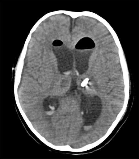 Imagen por Tomografía Cerebral computada que muestra catéter proximal fuera de cavidad ventricular.