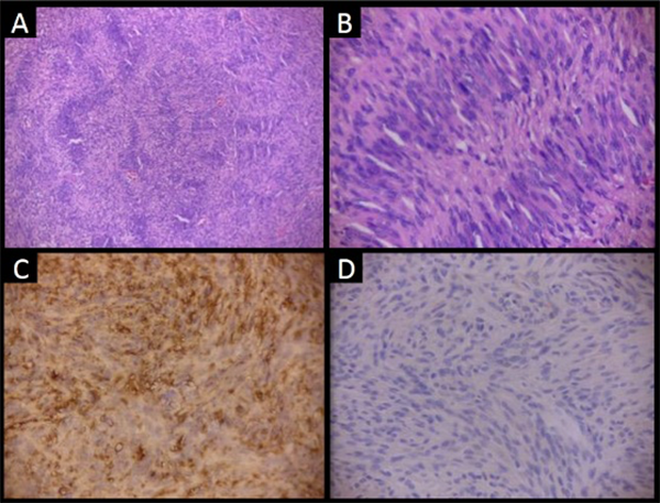 El Schwannoma es un tumor benigno de la vaina del nervio periférico, constituido exclusivamente por células de Schwann. 1 Histológicamente se caracteriza por un doble patrón morfológico que consta en las denominadas áreas Antoni A y áreas Antoni B. Las áreas Antoni A representan el componente celular de la lesión constituido por células fusiformes cuyos núcleos se disponen en empalizada o filas paralelas separadas por los respectivos procesos celulares alineados, originando los característicos cuerpos de Verocay, tal como lo muestra la Figura 2A del presente trabajo. Por su parte, las áreas Antoni B poseen menor densidad celular y predomina un estroma laxo, mixoide, con presencia de vasos sanguíneos prominentes. El estudio Inmunohistoquímico complementa los hallazgos histológicos y evidencia expresión difusa con proteína S100 en citoplasma y núcleos, con un patrón más reforzado en las áreas Antoni A, como lo demuestra la figura 2C. Asimismo la expresión negativa con EMA ayuda a descartar otros diagnósticos diferenciales para la topografía como el meningioma.