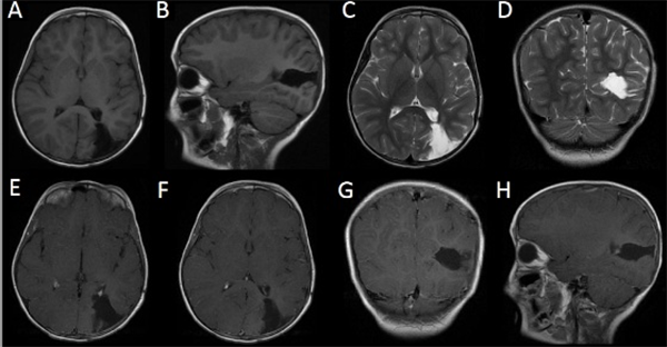 La tomografía computada (TC) de encéfalo sin contrate reveló una lesión isodensa respecto al parénquima cerebral, subcortical parieto-occipital izquierda, asociada a edema perilesional. La resonancia magnética nuclear (RMN) de encéfalo, con y sin contraste, evidenció una lesión sólida, parieto-occipital izquierda isointensa con la sustancia gris en T1 y de intensidad heterogénea en T2 con un gran edema asociado que, tras la administración de contraste, presenta un marcado realce homogéneo, sin restricción en la difusión (Figura 1).