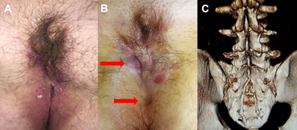 Paciente sexo masculino de 21 años de edad con antecedente de hipertricosis y tumoración subcutánea en región sacra desde el nacimiento que consulta por dolor y secreción purulenta de dos semanas de evolución. Al examen físico se observaron dos orificios profundos en el borde superior del pliegue interglúteo, sin déficit neurológico.