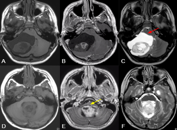 Figura 1. Imágenes ilustrativas de RM ponderadas en T1 (A,D), T1+ gadolino (B,E) y T2 (C,F), comparando una lesión predominantemente hemisférica y quística con efecto de masa y desplazamiento troncal (flecha roja) (A;C), con otra central y sólida con invasión troncal (flecha amarilla) (D:F). En el primer caso es más factible lograr la RT y menor riesgo de requerimiento de manejo post operatorio de hidrocefalia o recurrencia, mientras que en el segundo presenta un mayor riesgo de RST, mutismo y necesidad de manejo postoperatorio de hidrocefalia o recurrencia.