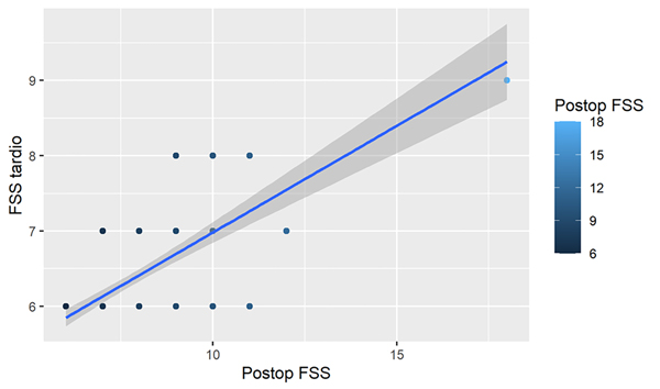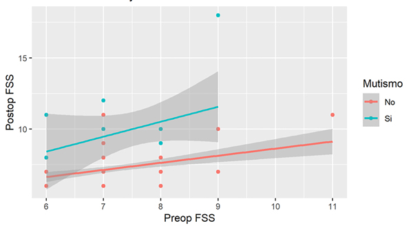 Se asumió la distribución normal de los datos en base al Teorema del Límite Central. Las variables categóricas son presentadas como frecuencias absolutas y relativas, las variables continuas como media y desvío estándar. Para evaluar la relación entre las diferentes variables independientes y la variable resultado, la FSS tardía y postoperatoria, se utilizó un análisis de regresión lineal. Los supuestos se verificaron previo al análisis. <0,05 p se utilizó como valor de corte para la significancia. Para el análisis estadístico se empleó el programa R 4.1.2. Para evaluar las variables independientes categóricas, el advenimiento del mutismo y tratamiento de la hidrocefalia postoperatoria, se empleó una regresión logística. Se eligieron las variables dependientes que demostraron una correlación individual significativa con base en las pruebas de Pearson, Chi Square y Fisher. <0,05 se utilizó como valor de corte para la significancia. Las variables dependientes seleccionadas se emplearon en un análisis de regresión logística multivariado para demostrar la importancia general y determinar el OR.